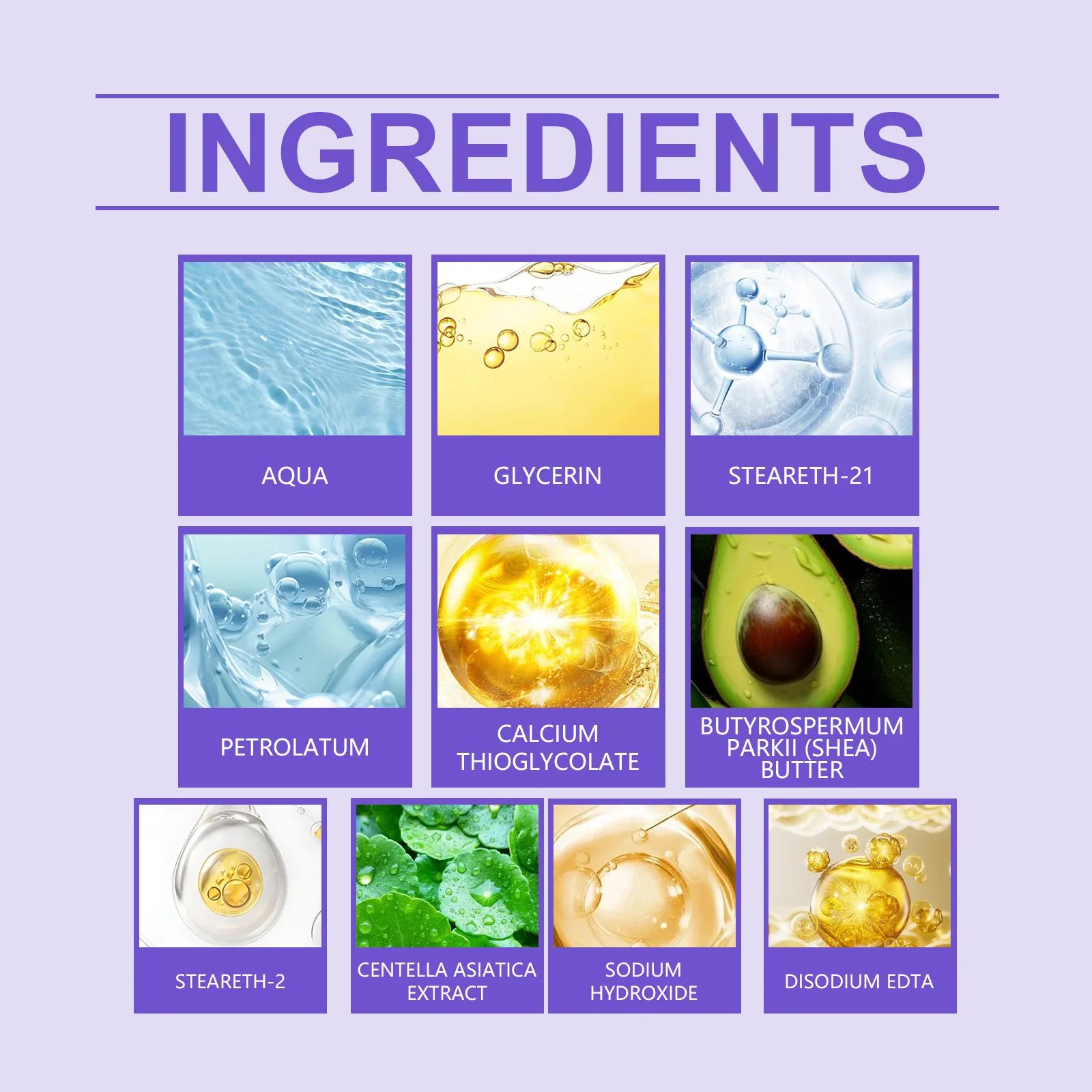 Formulated with Water, Glycerin, Steareth-21, Petrolatum, Calcium Thioglycolate, Shea Butter, Sodium Hydroxide, Steareth-2, Centella Asiatica Extract, Disodium EDTA, this cream soothes your skin while removing unwanted hair.