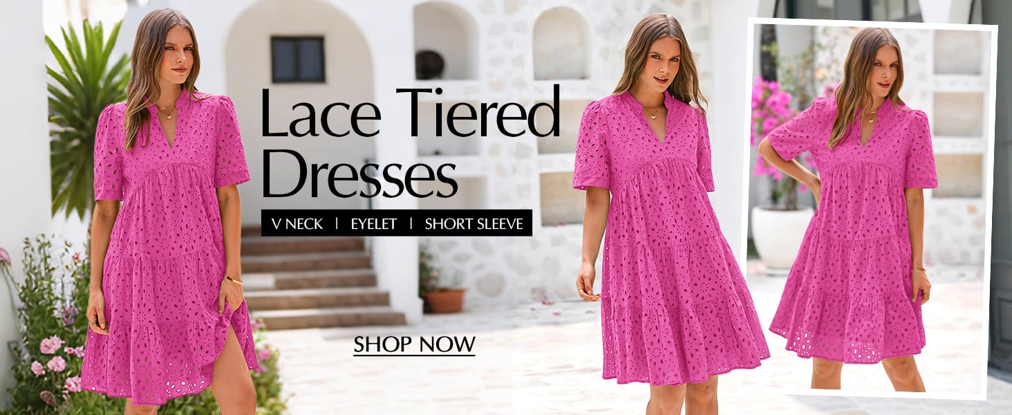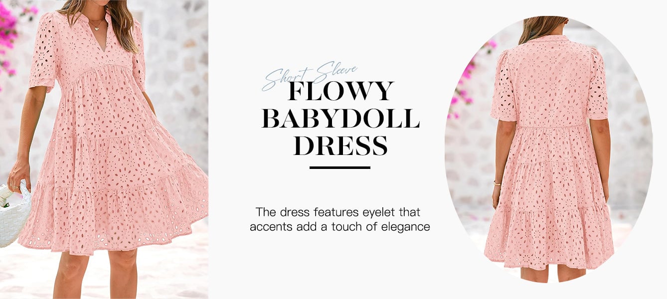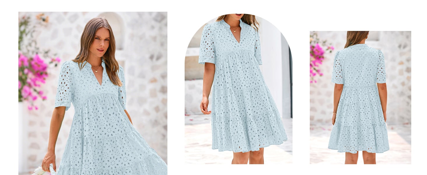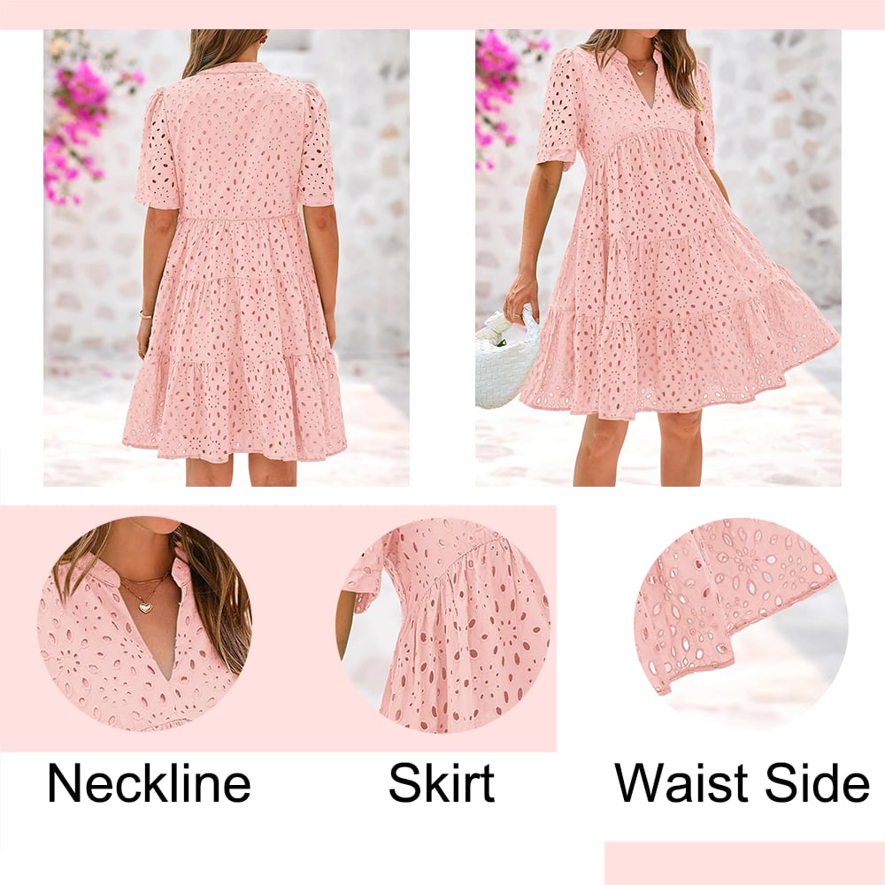 🔥DESIGNS: The Embroidery Eyelet Detail And Swing A-Line Shape Add a Playful And Feminine Touch To This Boho Mini Dress, While The V Neck And Short Sleeve Keep You Cool On Summer Days